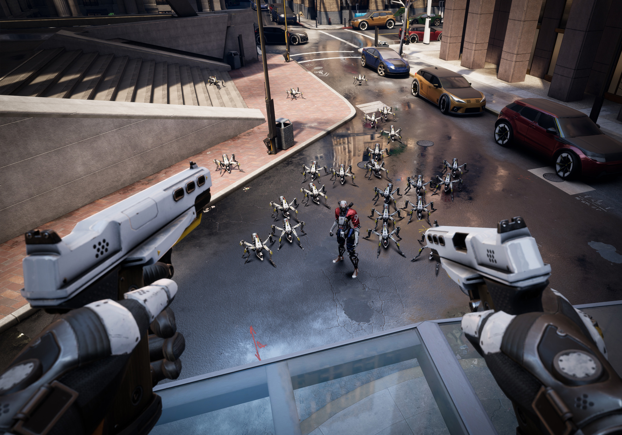 Особенностью проекта является физически достоверная система взаимодействия с миром и продвинутая баллистическая модель. Игрок может одновременно управлять двумя видами оружия, выполнять трюки вроде выстрела из-за спины или броска робота в другого врага, а также телепортироваться по арене для тактического преимущества. Миссии включают уничтожение волн роботов, спасение гражданских и борьбу с боссами, а система модификации оружия позволяет адаптировать его под свой стиль игры.